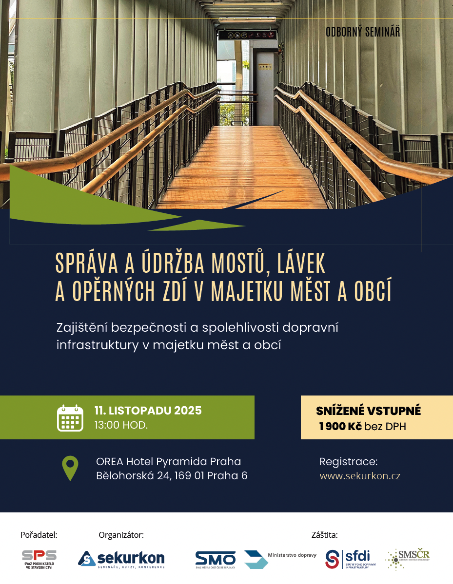 Ve spolupráci se Svazem měst a obcí, a pod záštitou Ministerstva dopravy, Vás zveme na odborný seminář: Správa a údržba mostů a lávek ve městech a obcích, který se uskuteční: 11.11.2025 od 13:00 v OREA Pyramida Hotel Praha.
